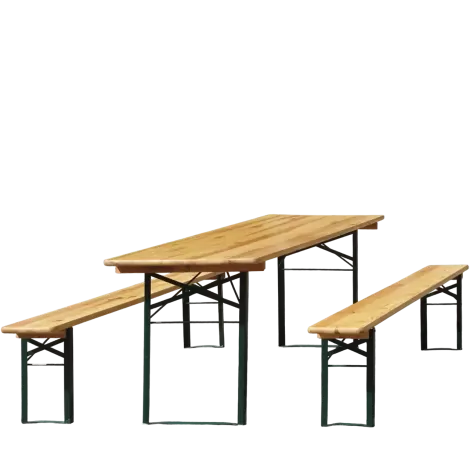 Tradiční třídílný pivní set – 1 x stůl, 2 x lavice s bezpečnostními zámky proti posunu při převozu a skladování. Montáž zvládne i 1 osoba.